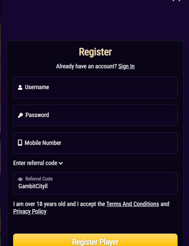 To initiate your registration with GAMBIT2, simply click the "PLAY NOW" button at the top of the page. This will lead you to the sign-up page, where you can create your unique username and password.